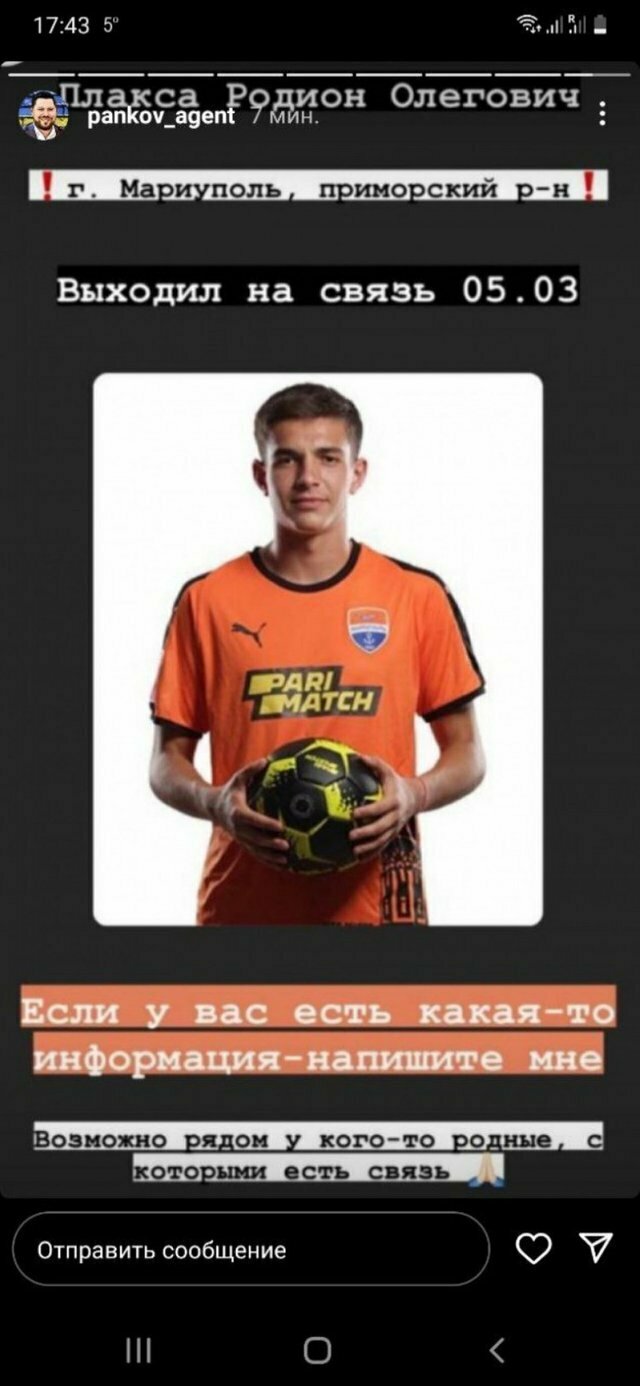 Украинское футбольное сообщество сообщило об исчезновении 20-летнего полузащитника «Мариуполя» Родиона Плаксы.