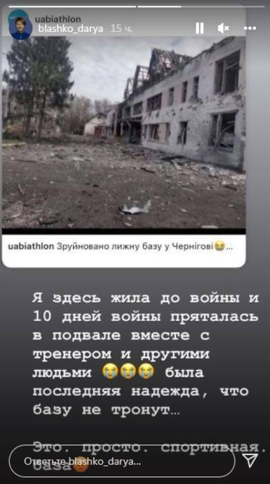 26-летняя биатлонистка сборной Украины Дарья Блашко, родившаяся в Беларуси, высказалась о разрушенной лыжной базе в Чернигове.