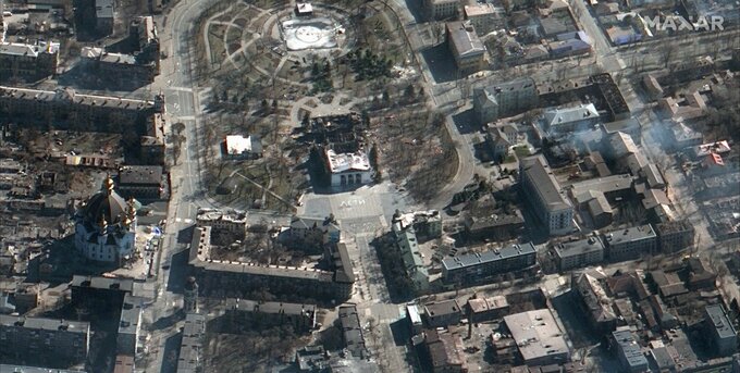 На спутниковом снимке от 19 марта видны масштабы разрушения. Также хорошо просматривается надпись «Дети» перед входом в театр.