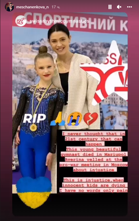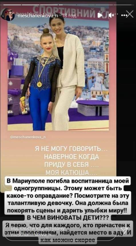 Главный редактор газеты Факты Александр Швец: «Екатерина Дьяченко, 11 лет. Маленькая звездочка украинской художественной гимнастики. Уже неоднократно побеждала на больших соревнованиях в своей возрастной категории. Мечтала о громких победах и имела для этого все основания. Погибла в Мариуполе под развалинами дома, разрушенного вражеским снарядом. Светлая память».