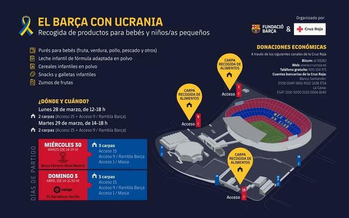 Также возле стадиона «Камп Ноу» «Барселона» откроет пункт сбора продуктов питания для украинских семей беженцев с детьми. Тем, кто не может прийти на стадион, предлагается поучаствовать в акции с помощью финансовых пожертвований.