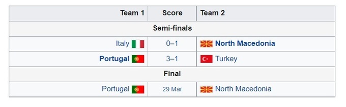 Таким образом, 29 марта Португалия и Северная Македония сразятся за путевку в финальную часть чемпионата мира. Встреча пройдет в Португалии.
