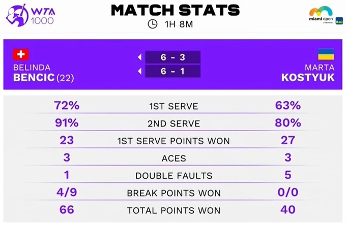 Марта Костюк (Украина) – Белинда Бенчич (Швейцария) – 3:6, 1:6
