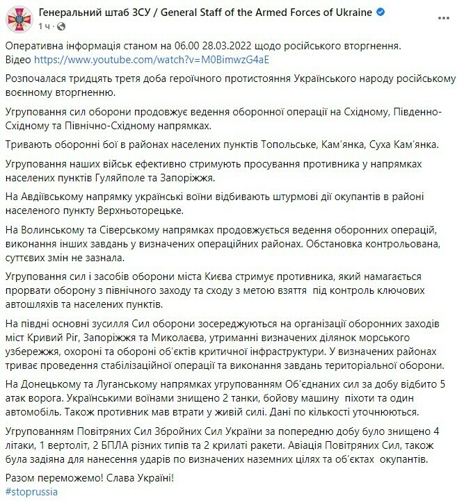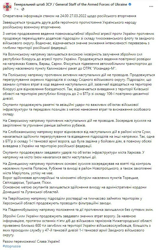 Пресс-центр командования Воздушных сил: «Сутки 27 марта сначала показались относительно спокойными в воздушном пространстве нашего государства. Впрочем, уже утром на Харьковщине был сбит один самолет, предположительно истребитель-бомбардировщик Су-34, а на Киевщине – вертолет и БПЛА рашистов.