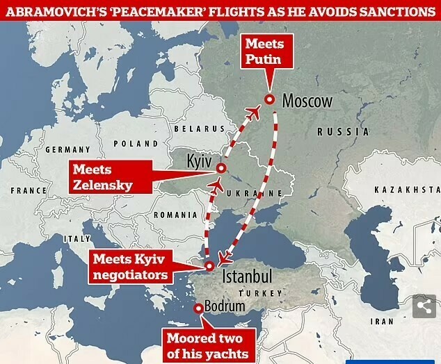 Британский таблоид сообщает, что Абрамович «летал между Стамбулом, Москвой и Киевом», выступая в качестве посредника между Зеленским и путиным.