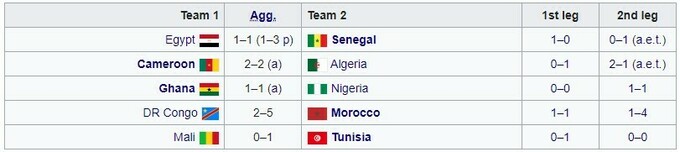 Это Гана, Сенегал, Марокко, Тунис и Камерун. Отметим, что камерунцы вырвали победу над Алжиром на 120+4 минуте благодаря тому, что действовало правило выездного гола.