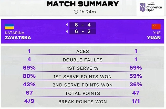 Катарина Завацкая (Украина) – Юань Юэ (Китай) – 6:4, 6:2