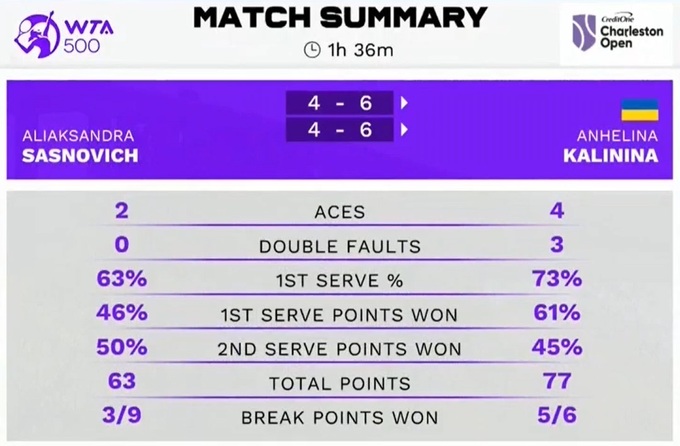 Ангелина Калинина (Украина) – Александра Саснович (Беларусь) – 6:4, 6:4