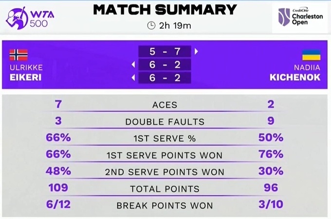 Надежда Киченок (Украина) – Ульрикке Эйкери (Норвегия) – 7:5, 2:6, 2:6