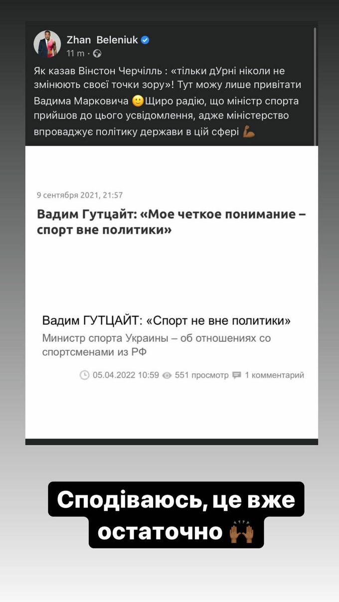 «Как говорил Уинстон Черчилль: «Только глупые никогда не меняют своей точки зрения»! Здесь могу только поздравить Вадима Марковича. Искренне радуюсь, что министр спорта пришел к этому осознанию, ведь министерство внедряет политику государства в этой сфере», – написал Беленюк в твиттере.