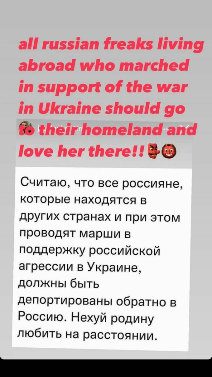 «Считаю, что все россияне, которые находятся в других странах и при этом проводят марши в поддержку российской агрессии в Украине, должны быть депортированы обратно в Россию.