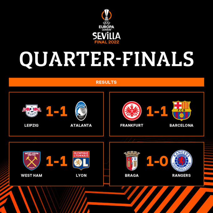 Состоялись еще три матча четвертьфинала Лиги Европы 2021/2022. «Барселона» на выезде не сумела обыграть «Айнтрахт», несмотря на то, что каталонцы завершали матч в большинстве. «Брага» дома минимально обыграла «Рейнджерс».