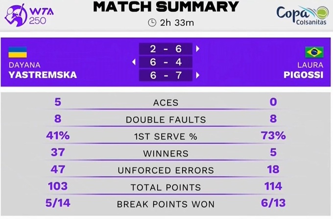 Даяна Ястремская (Украина) – Лаура Пигосси (Бразилия) – 2:6, 6:4, 6:7(3)