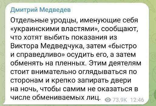 Кроме того, дмитрий медведев, карликовый алкоголик и владелец домика для уточки, решил в порыве белки угрожать украинским властям за кореша медведчука: