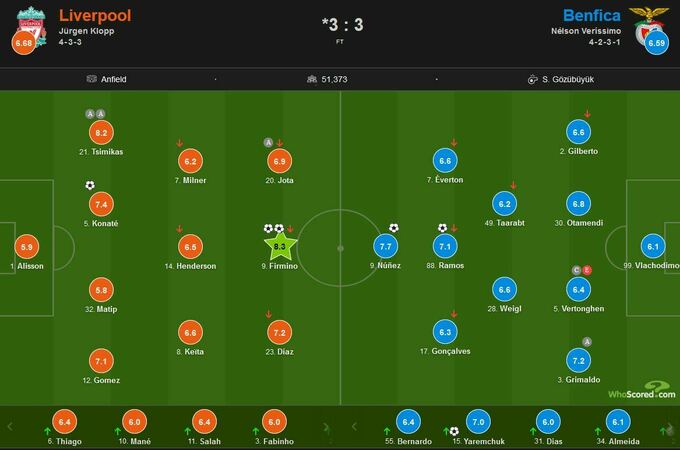 В ответном матче 1/4 финала Лиги чемпионов «Ливерпуль» и «Бенфика» сыграли в результативную ничью со счетом 3:3, что вывело в полуфинал мерсисайдцев.