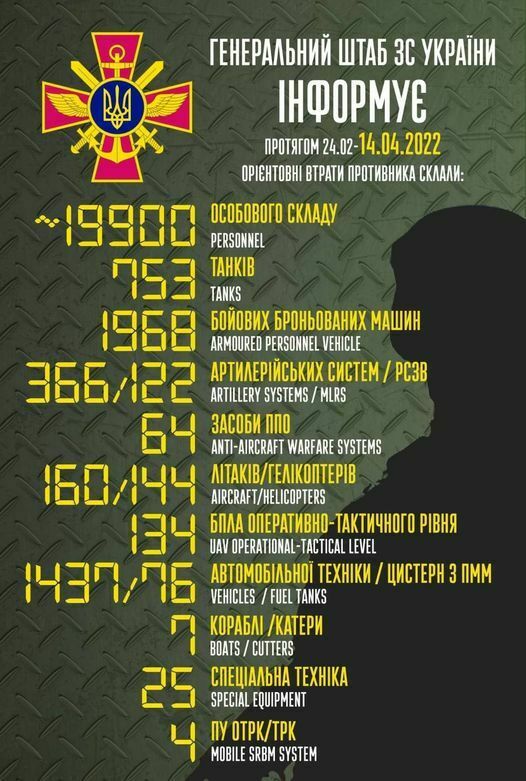 Генштаб ВСУ: Общие боевые потери противника с 24.02 по 14.04 ориентировочно составили: