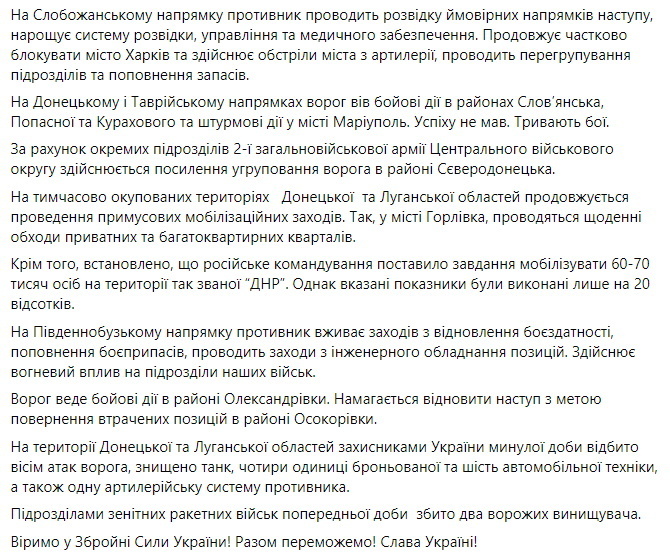 В рф пытаются снова комбинировать массированные ракетно-артиллерийские удары и сосредотачивать силы для наступления. Существенное количество российских войск и техники сейчас в Мариуполе, где украинские защитники удерживают оборону».