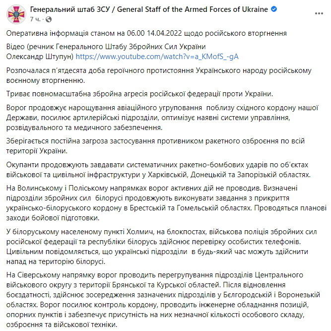 Оперативная информация Генерального штаба Вооруженных сил Украины на 06:00 четверга, 14 апреля.