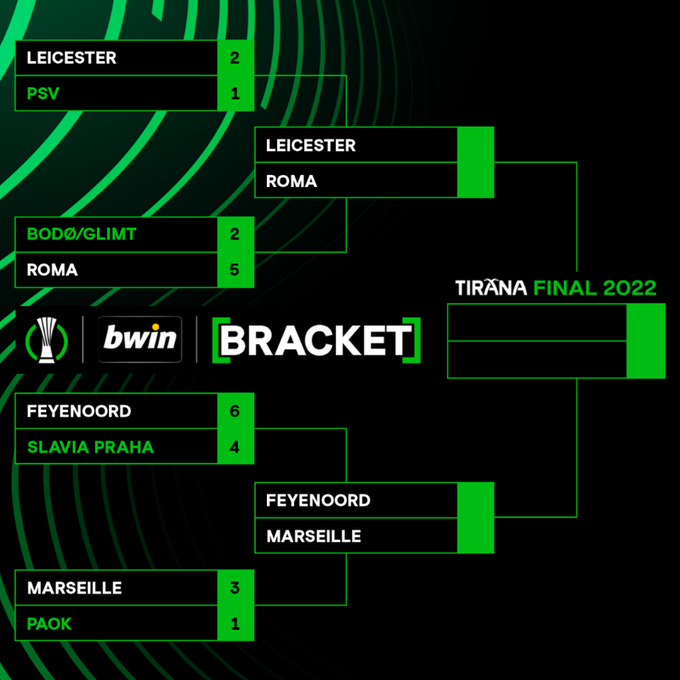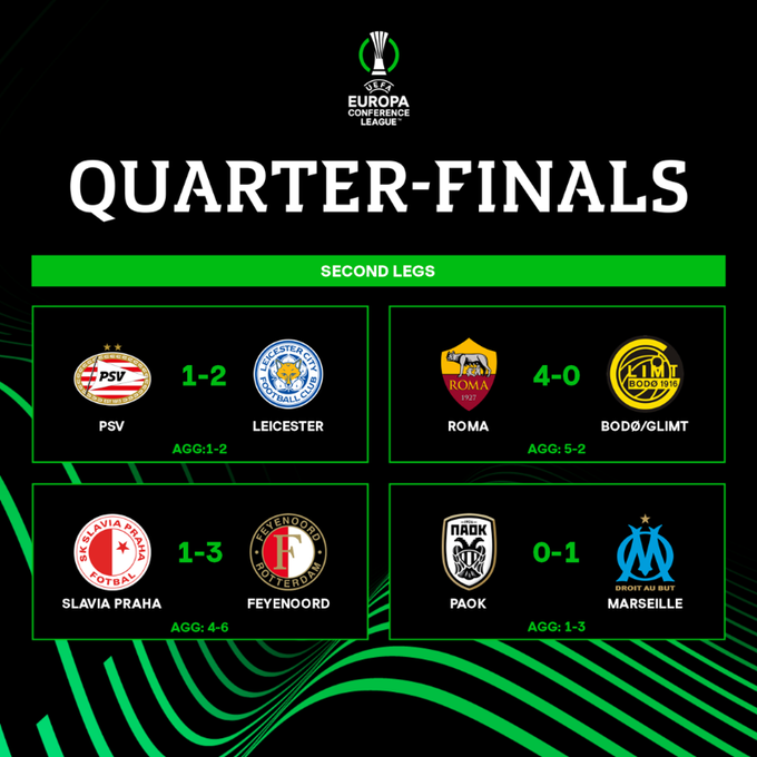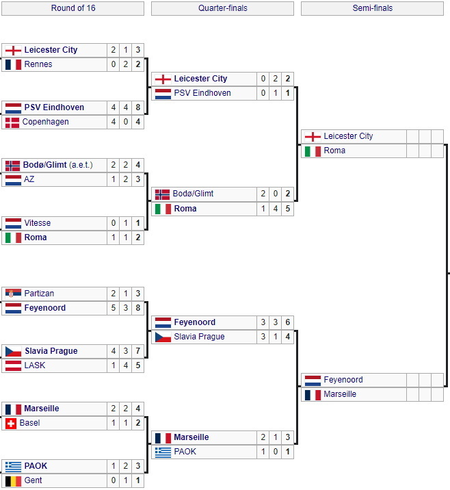 В полуфиналах «Лестер» сыграет против «Ромы», а «Фейеноорд» – против «Марселя».