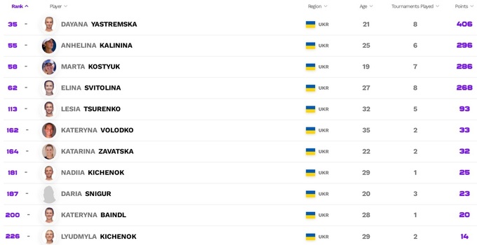 Украинки в рейтинге WTA