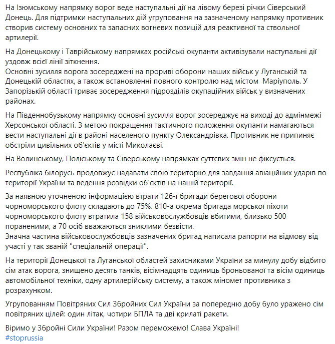 Генштаб: Общие боевые потери противника с 24.02 по 19.04 ориентировочно составили: