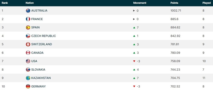 Сборная Австралии сохранила лидерство, Франция – вторую строчку. В топ-3 поднялась команда Испании.