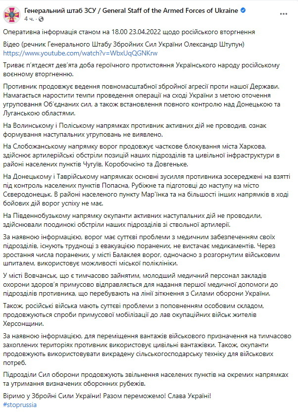 Вечерняя сводка Генштаба ВСУ за 23 апреля: Российские войска готовятся к наступлению на Северодонецк, а также сосредотачивают силы на захвате под полный контроль городов Попасная и Рубежное.