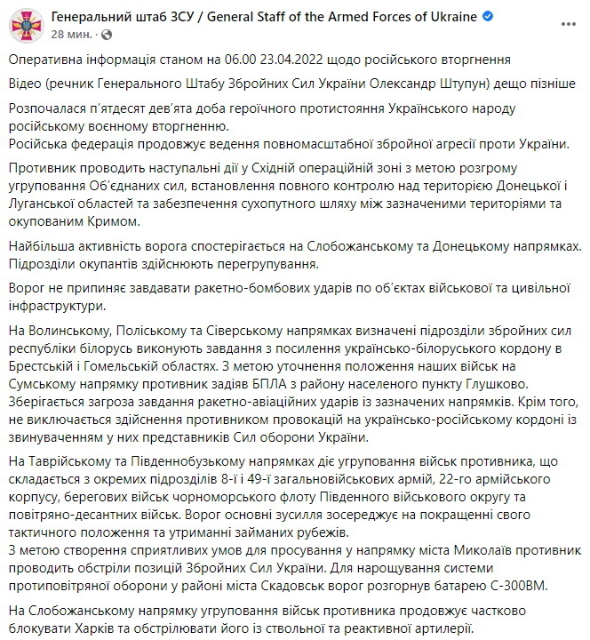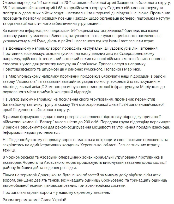 Утренняя сводка Генштаба: «Наибольшая активность врага наблюдается на Слобожанском и Донецком направлениях. Подразделения оккупантов осуществляют перегруппировку. Враг не прекращает наносить ракетно-бомбовые удары по объектам военной и гражданской инфраструктуры».