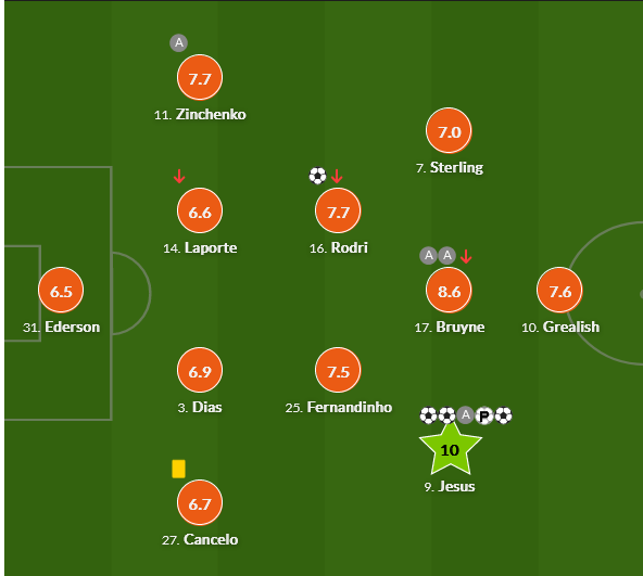 Самую высокую из возможных оценок получил форвард Габриэль Жезус, оформивший четыре гола. У него 10 баллов.