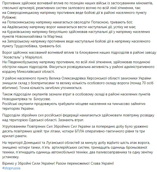 Сообщается, что город Кременная пал, сообщается о тяжелых боях к югу от Изюма, когда российские войска пытаются продвинуться в города Славянск и Краматорск с севера и востока. Украинские силы готовят оборону в Запорожье к возможному нападению россии с юга, добавили в ведомстве.