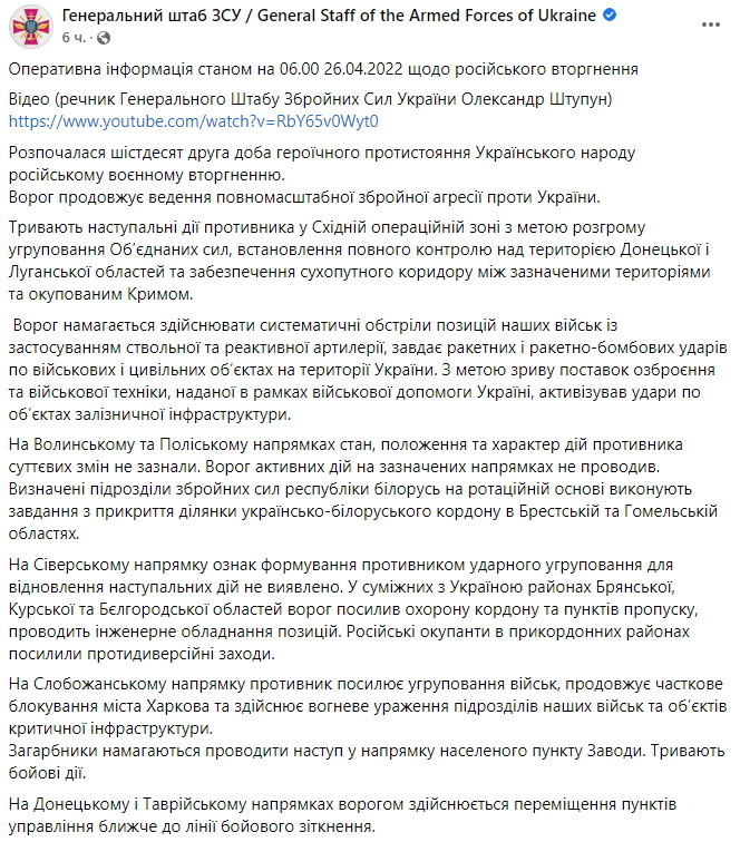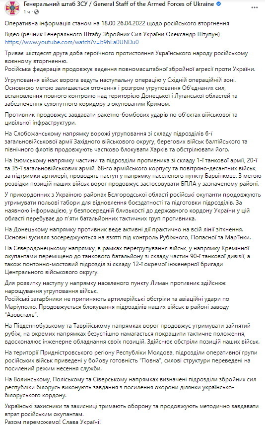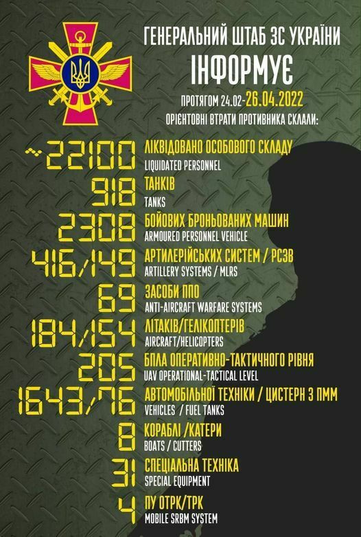 Спикер командования Воздушных сил ВСУ Юрий Игнат: «25 апреля российские оккупанты активизировали свои агрессивные действия, выпустили по Украине немало крылатых ракет, прежде всего по объектам инфраструктуры, узловым железнодорожным станциям. На Восточном и Южном направлениях рашисты совершили несколько авианалетов и, уже традиционно, потеряли три самолета».