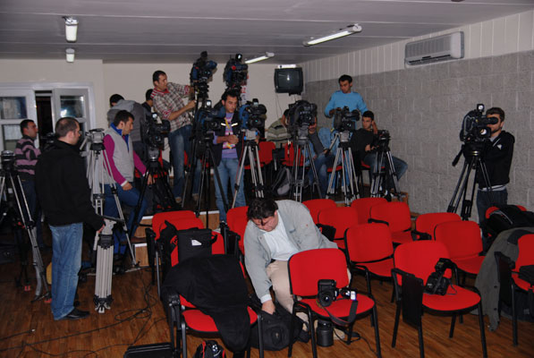 Юрий Трохимчук из «Команды» и Александр Зайчук из «Спорт-Экспресса в Украине» вместе с турецкими журналистами позируют на камеру, делая вид, что понимают друг друга