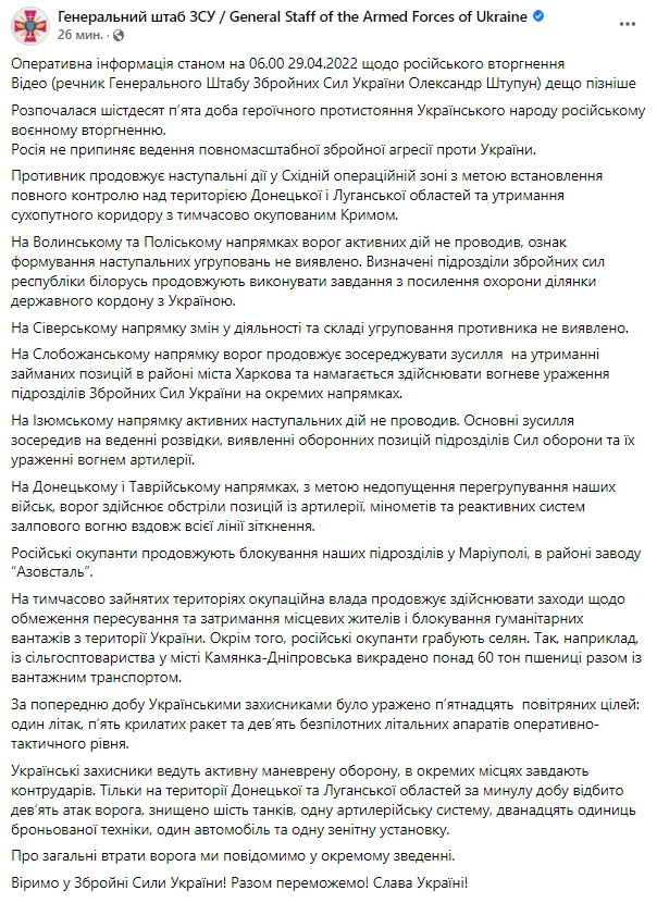 Таким образом, за сутки 28 апреля поражено 15 воздушных целей: 1 самолет (Су-34); 5 крылатых ракет; 9 БпЛА. Авиация Воздушных сил продолжает выполнение специальных задач в воздушном пространстве Украины.