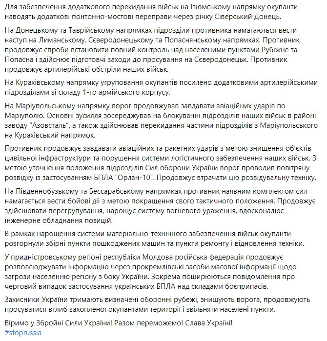 Наибольшие потери противника за прошедшие сутки наблюдались на Изюмском направлении.