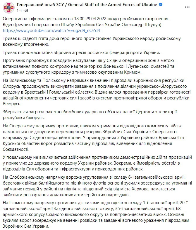 Спикер командования Воздушных сил ВСУ Юрий Игнат: «28 апреля противник наращивает свои силы и средства как на земле, так и в небе, участились авиационные удары, пуски крылатых ракет авиционного и морского базирования.