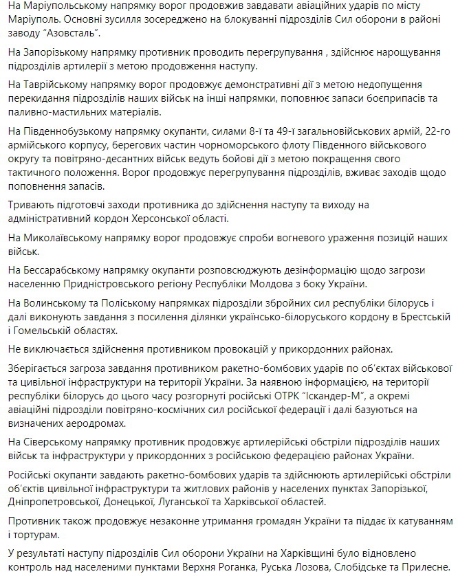 Вечерняя сводка Генштаба ВСУ: Враг продолжает ведение полномасштабной вооруженной агрессии против Украины и наступательные действия в Восточной операционной зоне. На Слобожанском направлении группировка войск противника продолжает наносить авиационные удары и артиллерийские обстрелы по городу Харькову.