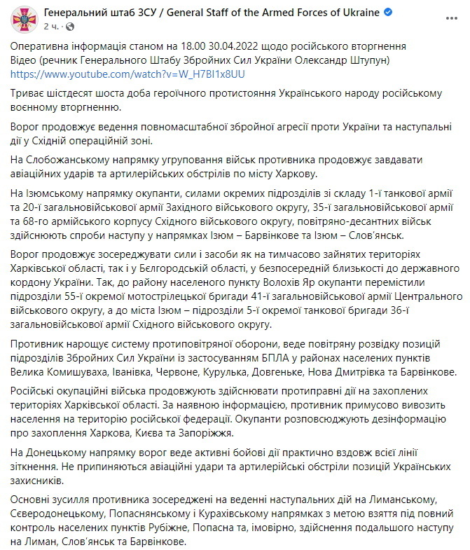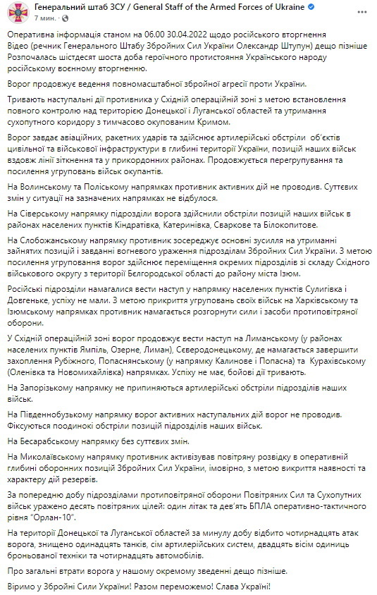 00:00. Начало 66-го дня войны, 30 апреля.