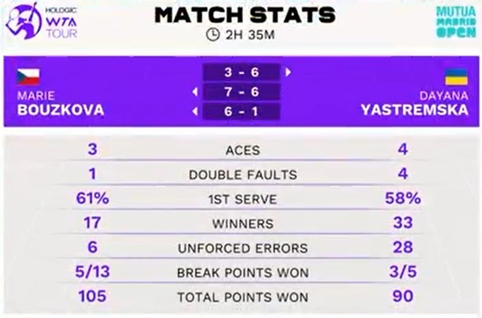 Даяна Ястремская (Украина) – Мария Боузкова (Чехия) – 6:3, 6:7(3), 1:6