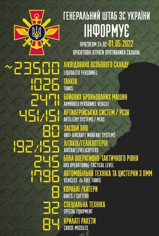 Данные Генштаба: Общие боевые потери противника с 24.02 по 01.05 ориентировочно составили: