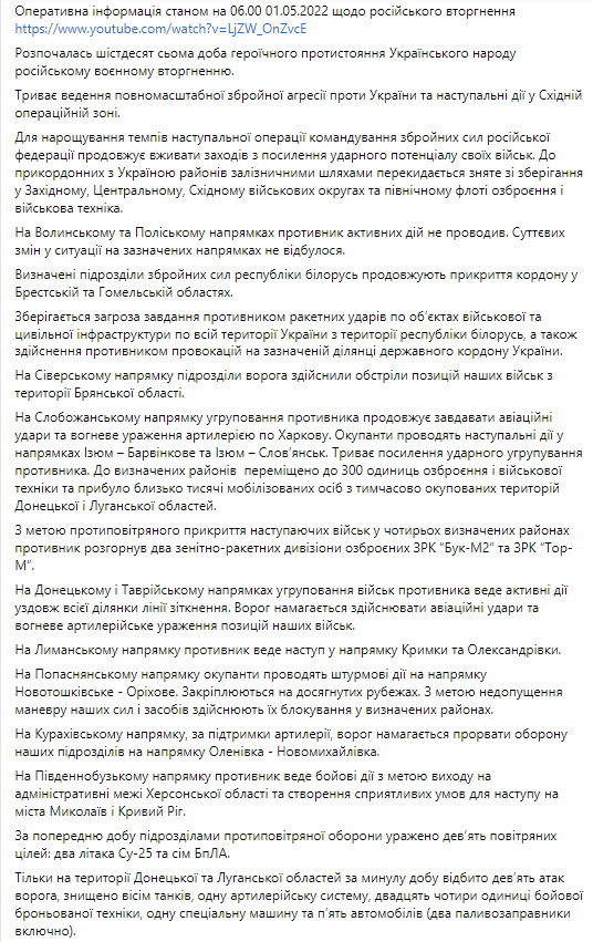 Сводка Генштаба ВСУ: На Слобожанском направлении враг обстреливал позиции сил обороны из минометов в районах населенных пунктов Уды и Прудянка. Также российские оккупанты понесли потери в районе населенного пункта Старый Салтов. На Изюмском направлении противник пытался вести наступательные действия, успеха не имел, понес потери в живой силе и технике.
