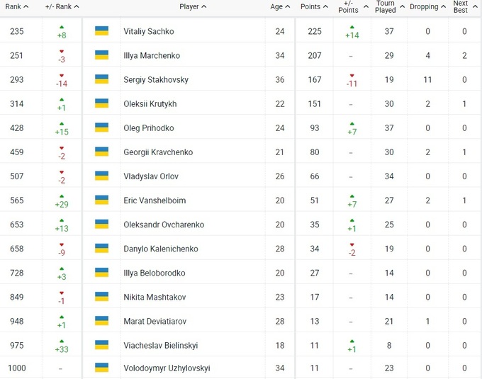Что касается украинцев, то Виталий Сачко добавил восемь строчек, Илья Марченко опустился на три места. Алексей Крутых, Олег Приходько и Александр Овчаренко обновили личные рекорды. Вячеслав Белинский вошел в первую тысячу рейтинга ATP.