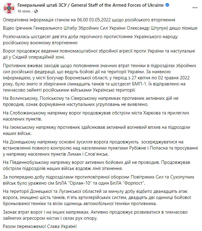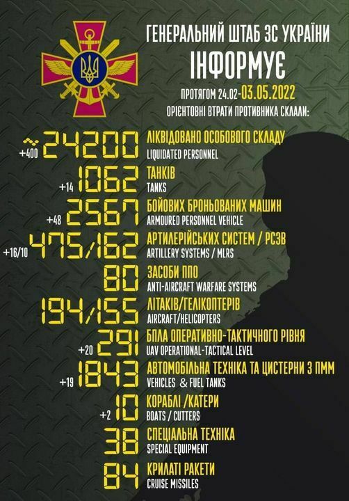 Спикер командования Воздушных сил ВСУ Юрий Игнат: «В течение суток 2 мая пилотируемая авиация оккупантов фактически не входила в зону действия украинского ПВО. В то же время противник продолжает наносить ракетные удары, наращивает в воздушном пространстве Украины присутствие беспилотных летательных аппаратов, которые дают целеуказания артиллерии, осуществляют воздушную разведку и коррекцию огня.