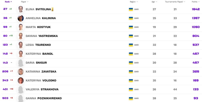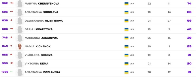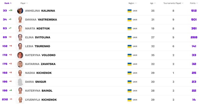 Ангелина Калинина после успешного выступления в Мадриде немного обошла в этом рейтинге Даяну Ястремскую, обе пока в четвертом десятке. Также немного добавила и Марта Костюк.