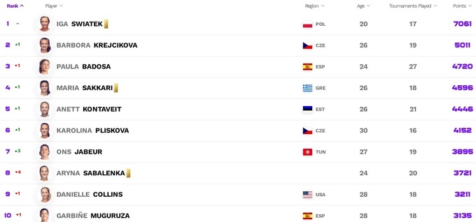 После завершения крупного турнира в Мадриде в первой десятке состоялось несколько значимых изменений. Чемпионка Madrid Open Онс Жабер поднялась с десятого на седьмое место, повторив личный рекорд. Прошлогодняя победительница этих соревнований Арина Соболенко опустилась с четвертой на восьмую позицию. У остальных минимальные изменения.