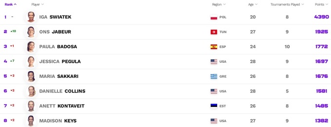 В Чемпионской гонке Жабер совершила невероятный рывок и поднялась на вторую позицию, уступая только непревзойденной Иге Свёнтек. Также в топ-4 теперь находится и Пегула.
