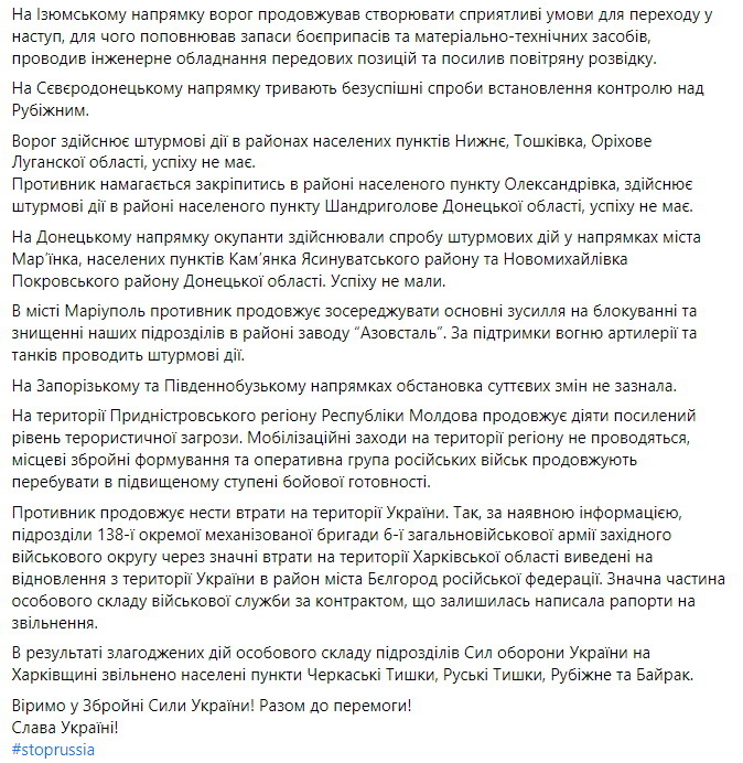 Генштаб ВСУ: «В результате слаженных действий личного состава подразделений Сил обороны Украины в Харьковской области освобождены населенные пункты Черкасские Тишки, Русские Тишки, Рубежное и Байрак».