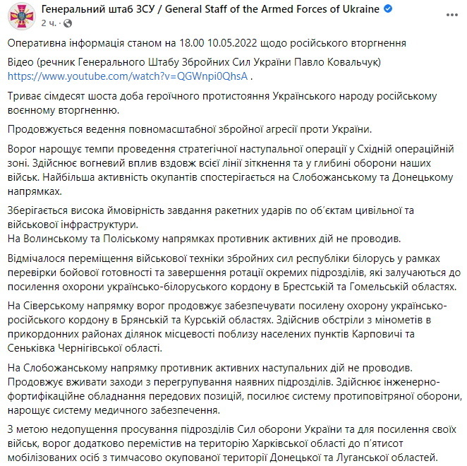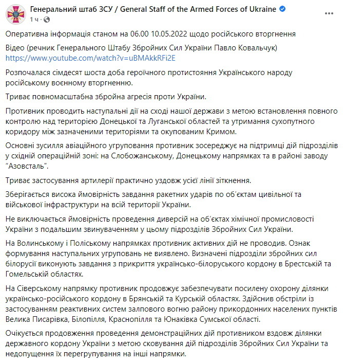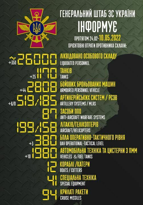 Генеральный штаб ВСУ: Общие боевые потери противника с 24.02 по 10.05 ориентировочно составили: