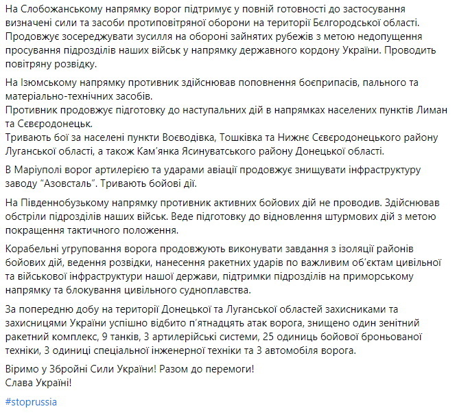 Генштаб ВСУ: Основные усилия авиационной группировки противник сосредоточивает на поддержке подразделений в восточной операционной зоне: на Слобожанском, Донецком направлениях и в районе завода Азовсталь.