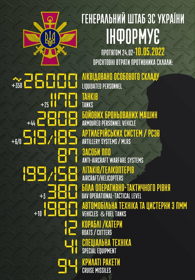 Генеральный штаб Вооруженных сил Украины отчитался об актуальных потерях российских захватчиков на украинских землях. Всего за 76 дней войны ВСУ уничтожили 26 тысяч вражеских солдат.