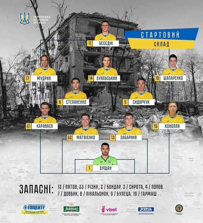 Стартовый состав сборной Украины: 1. Георгий Бущан, 15. Ефим Конопля, 13. Илья Забарный, 22. Николай Матвиенко, 21. Александр Караваев, 5. Сергей Сидорчук, 6. Тарас Степаненко, 17. Михаил Мудрик, 10. Николай Шапаренко, 14. Виталий Буяльский, 11. Артем Беседин.